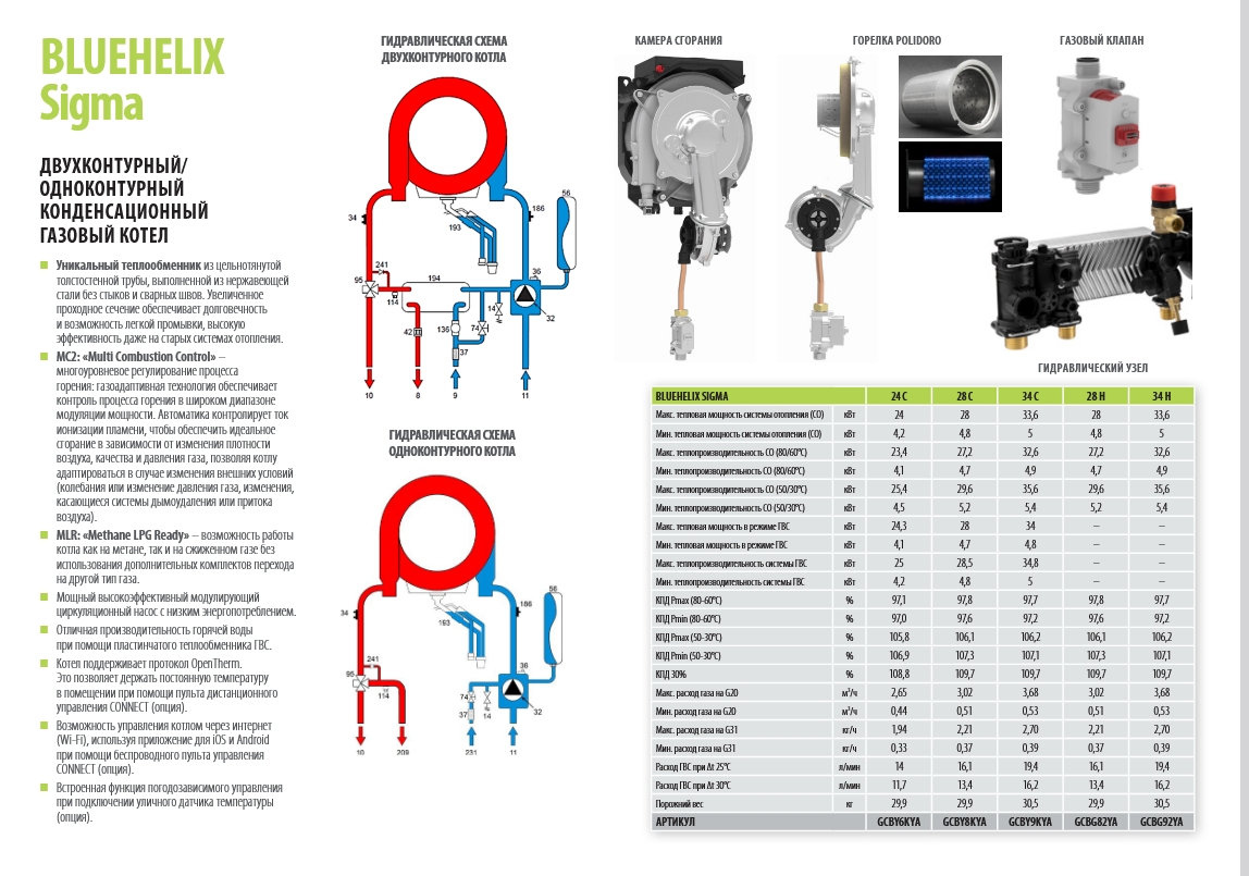 Ferroli Bluehelix Sigma - газовый котел с уникальным теплообменником надежен и функционален. Передняя стенка камеры сгорания выполнена из алюминия, не имеет теплоизоляции за счет охлаждения поступающим в камеру воздухом. Котел может работать на других типах газа с различным составом. Котел Bluehelix Sigma обладает компактными размерами, что позволяет установить его практически в любых помещениях. Благодаря интегрированной системе управления и дисплею с интуитивно понятным интерфейсом, пользователь может легко настроить котел под требуемые параметры и контролировать его работу.